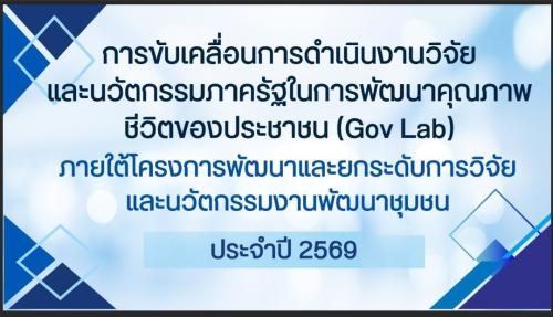 - นวัตกรรมภาครัฐในการพัฒนาคุณภาพชีวิตของประชาชน (Government Innovation Lab : Gov Lab) ซึ่งเป็นการขับเคลื่อนแนวคิดนวัตกรรมภาครัฐ สู่การพัฒนาคุณภาพชีวิตของประชาชนอย่างเป็นรูปธรรม