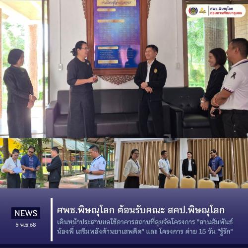 ศพช.พิษณุโลก ต้อนรับคณะ สคป.พิษณุโลก เดินหน้าประสานขอใช้อาคารสถานที่ ลุยจัดโครงการ "สานสัมพันธ์น้องพี่ เสริมพลังต้านยาเสพติด" และ โครงการ ค่าย 15 วัน "รู้รัก" วันที่ 5 พฤศจิกายน 2568