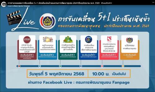 การถ่ายทอดสดครั้งนี้จัดขึ้นเพื่อสร้างความเข้าใจในแนวทางการดำเนินงานตาม 5+1 ประเด็นเน้นย้ำของกรมการพัฒนาชุมชน ซึ่งเป็น “เข็มทิศเชิงยุทธศาสตร์” ในการเชื่อมโยงภารกิจการพัฒนาชุมชนกับเป้าหมาย “การพัฒนาชุมชนอย่างยั่งยืน” โดยมีผู้รับผิดชอบหลักแต่ละประเด็นร่วมแลกเปลี่ยนแนวทางการดำเนินงาน และแนวทางการประเมินผล เพื่อให้บุคลากรทุกระดับสามารถนำไปใช้ขับเคลื่อนงานได้อย่างถูกต้องและมีประสิทธิภาพ สำหรับการขับเคลื่อน 5+1 ประเด็นเน้นย้ำของกรมการพัฒนาชุมชน ประจำปีงบประมาณ พ.ศ. 2569 ประกอบด้วย 1️) OTOP PLUS : การยกระดับการขับเคลื่อนงาน OTOP สู่ความยั่งยืน 2️) หมู่บ้านกองทุนแม่ของแผ่นดินต้นแบบ : สังคมเข้มแข็งปลอดภัย 3️) เศรษฐกิจพอเพียงสู่ความยั่งยืน : ขับเคลื่อนปรัชญาเศรษฐกิจพอเพียงในทุกมิติ 4️) พัฒนาศักยภาพเพื่อการพัฒนาชุมชน : เสริมสมรรถนะบุคลากรและเครือข่าย5️) การบริหารจัดการกองทุนพัฒนาบทบาทสตรี : บริหารงานอย่างมีประสิทธิภาพ