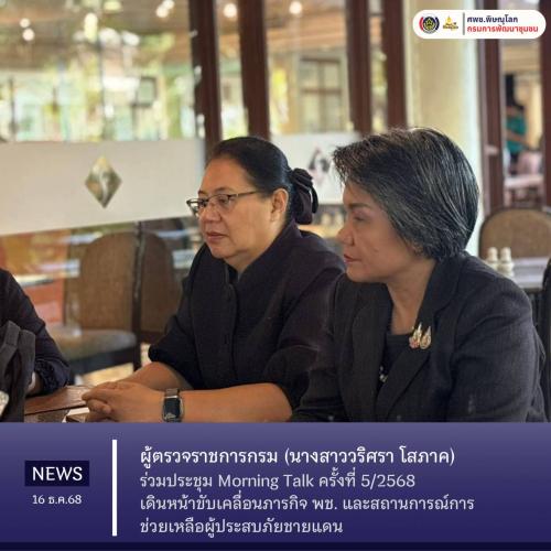 ผู้ตรวจราชการกรม (นางสาววริศรา โสภาค) ร่วมประชุม Morning Talk ครั้งที่ 5/2568 เดินหน้าขับเคลื่อนภารกิจ พช. และสถานการณ์การช่วยเหลือผู้ประสบภัยชายแดน วันอังคารที่ 16 ธันวาคม 2568