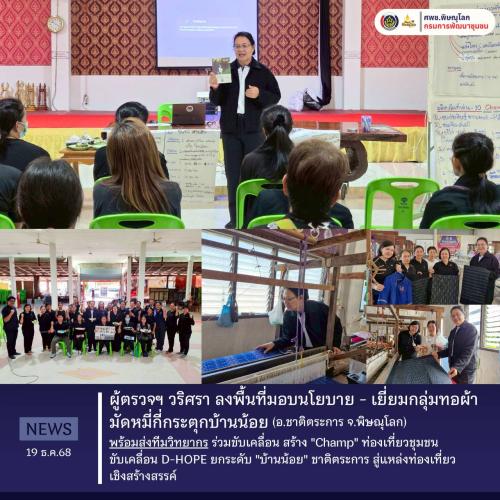 นางสาววริศรา โสภาค ผู้ตรวจราชการกรม ปฏิบัติหน้าที่ ผู้อำนวยการศูนย์ศึกษาและพัฒนาชุมชนพิษณุโลก ลงพื้นที่มอบนโยบายและส่งทีมวิทยากร ร่วมสนับสนุนการขับเคลื่อน "โครงการค้นหาผู้จัดโปรแกรมท่องเที่ยวเชิงสร้างสรรค์ (Champ)" เพื่อพัฒนาศักยภาพผู้ประกอบการชุมชนสู่การเป็นมืออาชีพ