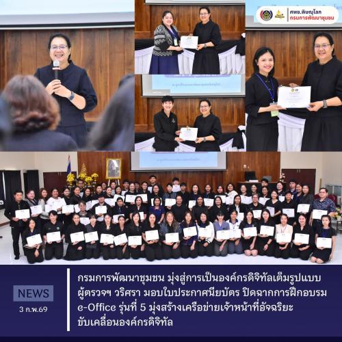 กรมการพัฒนาชุมชน มุ่งสู่การเป็นองค์กรดิจิทัลเต็มรูปแบบ ผู้ตรวจฯ วริศรา มอบใบประกาศนียบัตร ปิดฉากการฝึกอบรม e-Office รุ่นที่ 5 มุ่งสร้างเครือข่ายเจ้าหน้าที่อัจฉริยะ ขับเคลื่อนองค์กรดิจิทัล วันที่ 3 กุมภาพันธ์ 2569