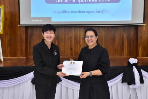 นางสาววริศรา โสภาค ผู้ตรวจราชการกรม ปฏิบัติหน้าที่ ผู้อำนวยการศูนย์ศึกษาและพัฒนาชุมชนพิษณุโลก ให้เกียรติเป็นประธานในพิธีมอบใบประกาศนียบัตรแก่ผู้เข้ารับการฝึกอบรมโครงการสร้างความรู้ความเข้าใจเกี่ยวกับระบบบริหารจัดการสำนักงาน (e-Office) กรมการพัฒนาชุมชน รุ่นที่ 5 ดำเนินการะหว่างวันที่ 2 - 3 กุมภาพันธ์ 2569