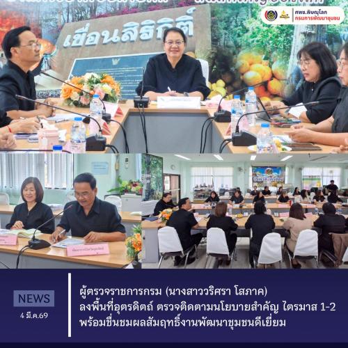 วันที่ 4 มีนาคม 2569 เวลา 09.00 น. ณ ห้องประชุมสำนักงานพัฒนาชุมชนจังหวัดอุตรดิตถ์ นางสาววริศรา โสภาค ผู้ตรวจราชการกรม ปฏิบัติหน้าที่ผู้อำนวยการศูนย์ศึกษาและพัฒนาชุมชนพิษณุโลก ลงพื้นที่จังหวัดอุตรดิตถ์ เพื่อตรวจติดตามผลการปฏิบัติราชการตามประเด็นตรวจราชการกระทรวงมหาดไทย ภารกิจกรมการพัฒนาชุมชน และผนการตรวจราชการที่อธิบดีกรมการพัฒนาชุมชนให้ความเห็นชอบ ประจำเดือนมีนาคม 2569 มุ่งเน้นการขับเคลื่อนงานให้บรรลุเป้าหมายตามแผนปฏิบัติราชการอย่างมีประสิทธิภาพ โดยมี นายบรรพจน์ จันทร์งาม พัฒนาการจังหวัดอุตรดิตถ์ ผู้อำนวยการกลุ่มงาน งาน พัฒนาการอำเภอ นักวิชาการ และเจ้าหน้าที่พัฒนาชุมชนสำนักงานพัฒนาชุมชนจังหวัดอุตรดิตถ์ ร่วมให้ข้อมูลและนำเสนอความก้าวหน้าการดำเนินงาน ซึ่งผู้ตรวจราชการกรมฯ ได้ให้ความสำคัญและมีข้อสั่งการในประเด็นหลัก ดังนี้: