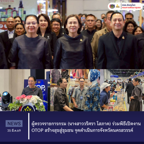 📅 วันที่ 25 มีนาคม 2569 เวลา 17.30 น. ณ นครสวรรค์ Hall ชั้น 3 ศูนย์การค้าเซ็นทรัลนครสวรรค์ อำเภอเมืองนครสวรรค์ จังหวัดนครสวรรค์ นางสาววริศรา โสภาค ผู้ตรวจราชการกรมการพัฒนาชุมชน ปฎิบัติหน้าที่ผู้อำนวยการศูนย์ศึกษาและพัฒนาชุมชนพิษณุโลก ในฐานะผู้แทนกรมการพัฒนาชุมชนเป็นผู้กล่าวรายงานในพิธีเปิดงาน OTOP สร้างสุขสู่ชุมชน จุดดำเนินการครั้งที่ 18 จังหวัดนครสวรรค์ โดยมีนางสาวชุติพร เสชัง ผู้ว่าราชการจังหวัดนครสวรรค์ เป็นประธานฯ พร้อมด้วยรองผู้ว่าราชการจังหวัด นครสวรรค์และอุทัยธานี ผู้ตรวจราชการกรมการพัฒนาชุมชน หัวหน้าส่วนราชการ และเครือข่ายกลุ่มอาชีพ ผู้ผลิต ผู้ประกอบการ OTOP เข้าร่วมพิธีเปิดอย่างคึกคัก เพื่อเดินหน้ายกระดับผลิตภัณฑ์ชุมชน เพิ่มช่องทางการตลาด และสร้างรายได้หมุนเวียนให้แก่เศรษฐกิจฐานรากในพื้นที่ภาคเหนือตอนล่าง