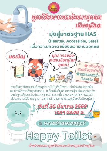 ศูนย์ศึกษาและพัฒนาชุมชนพิษณุโลก ยกระดับการให้บริการสู่มาตรฐานสากลด้วยการรับรองมาตรฐานส้วมสาธารณะระดับประเทศ (HAS) และเครื่องหมาย “HAPPY TOILET” มุ่งสร้างความประทับใจและสุขอนามัยที่ดีให้แก่ผู้มาเยือนภายใต้แนวคิด “ส้วมสาธารณะ...เป็นมากกว่าแค่ห้องน้ำ”