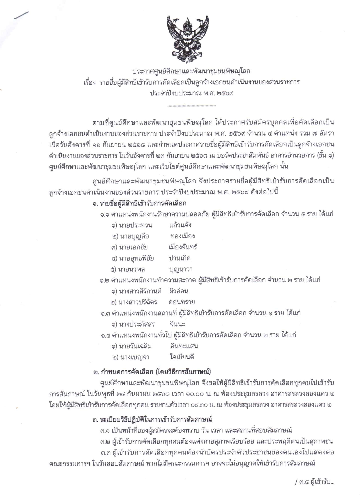 ประกาศศูนย์ศึกษาและพัฒนาชุมชนพิษณุโลก เรื่อง รายชื่อผู้มีสิทธิเข้ารับการคัดเลือกเป็นลูกจ้างเอกชนดำเนินงานของส่วนราชการ ประจำปีงบประมาณ พ.ศ.2569